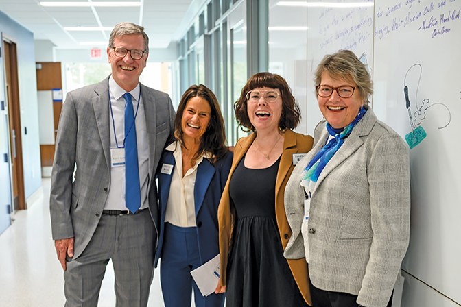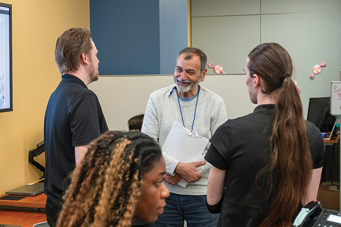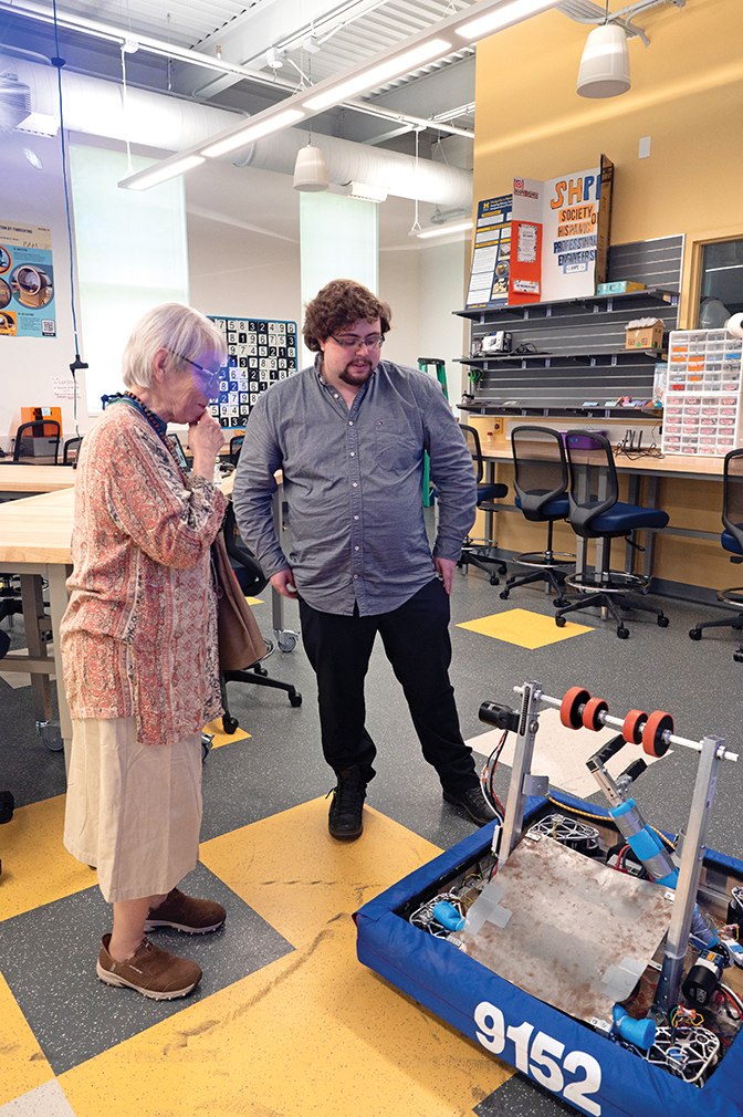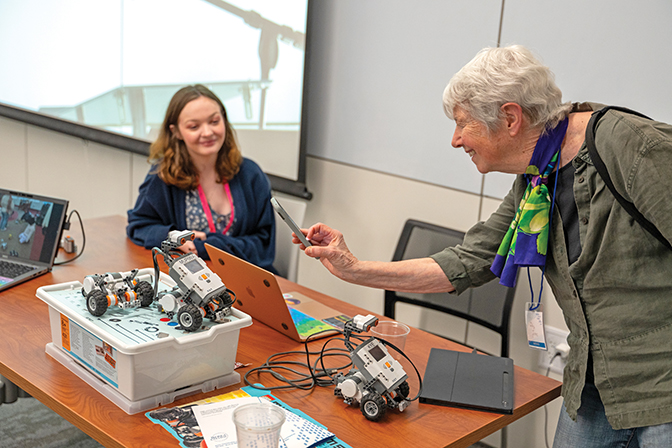 Computer Science major, Rebeccah H. Hunter ʼ17, spoke about her experience as a computer science student at Berea and how a building like this will transform the learning opportunities for the next generation of Berea students in the field. Photo by Crystal Wylie ’05 The CMIT Building is the new home of Berea College News and Radio, featuring three television sets, a news anchor desk and an on-air studio to highlight original online programming from students, faculty, staff and community members. One stop on the CMIT building tours was on this set, where a student filmed friends and alumni talk about the reasons they supported the Technology Like No Other campaign. Photo by Brooklynn KenneyBerea students provide live demonstrations of projects on which they worked to the first-time visitors touring the building. Photo by Sonam Tsering ’27Alexandra Yuhas ʼ18 signs a banner at the dedication ceremony, marking her attendance. Yuhas, a computer science major, also gifted an office space in the CMIT building. Photo by Sonam Tsering ’27 Berea students were placed in various locations throughout the CMIT building to display their work, demonstrate aspects of the new spaces and welcome first-time visitors to the building. Photo by Crystal Wylie ’05President Cheryl Nixon welcomed 160+ guests who attended the dedication ceremony on April 25 from 22 states, including Berea College Board of Trustees members; campaign donors (alumni, non-alumni donors and representatives from corporations and foundations); and Berea faculty, staff, students and retirees. Photo by Sonam Tsering ’27 Libby Faulk Jones, retired English professor, snaps a picture of an interesting robotics demonstration during her tour of the CMIT building. Photo by Zack ThompsonDr. Esfandiar Lohrasbpour ʼ74 (right) talks with IT staff member Billy Lakes and others in one of the new IT spaces in the CMIT building. Photo by Brooklynn Kenney Left to right: Former President Lyle Roelofs, Hon. ʼ22, Board of Trustees Past President Stephanie Zeigler, Chief Strategy Officer Teri Thompson, and Laurie Roelofs, Hon. ʼ22 share a laugh as they catch up at the CMIT building dedication. The plans and fundraising campaign for the building began under Dr. Roelofsʼ tenure. Photo by Crystal Wylie ’05